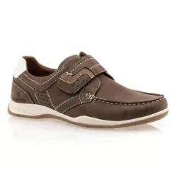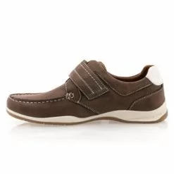 La nuance marron de ces chaussures bateau à scratch est contrastée de blanc sur les fines surpiqures, le col de cheville rembourré et la semelle de marche souple et résistante. Le style casual et naturel de ce modèle trouvera facilement sa place dans un large éventail de tenues vestimentaires.