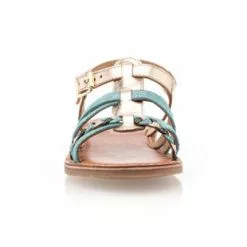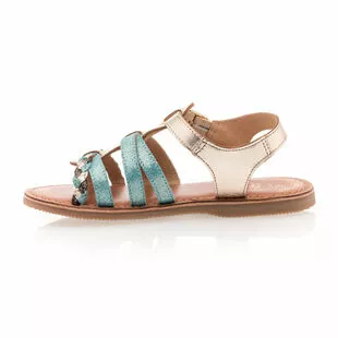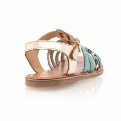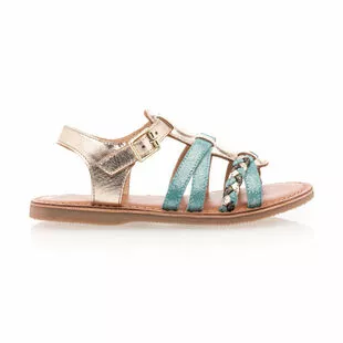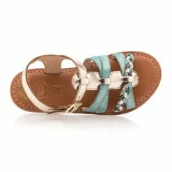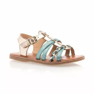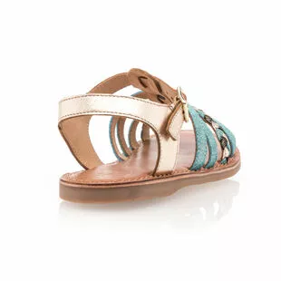 Les lanières en cuir de ces sandales pour enfant Les Fées de Bengale associent une nuance dorée et un bleu turquoise dans un style renversant de charme. Et si on les utilisait, par exemple, pour accompagner une petite robe tee-shirt rouge framboise à manches courtes ?